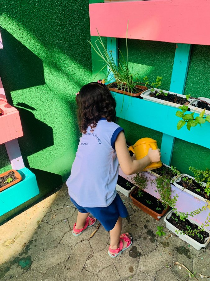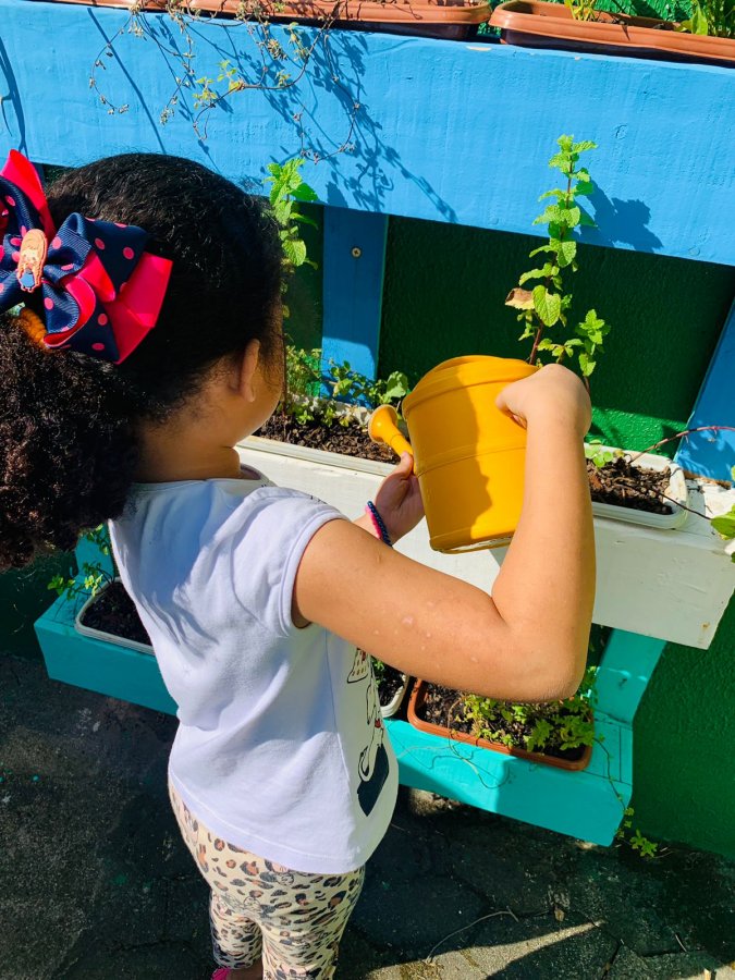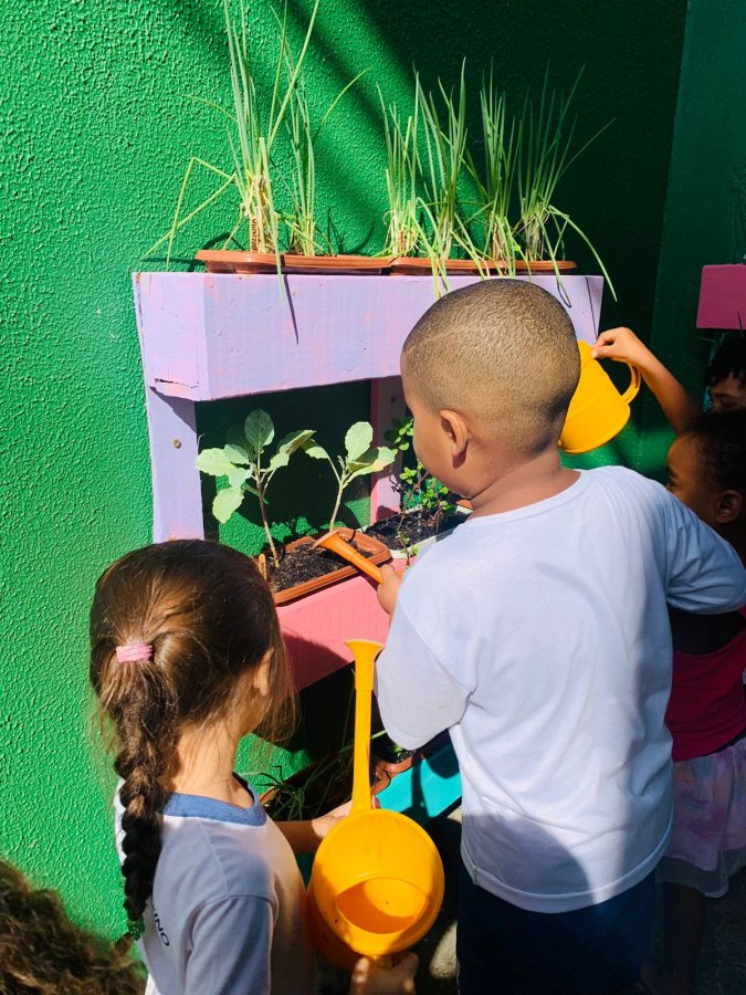 E as turmas de 3 a 5 anos estão com uma agenda matutina e vespertina para MOLHAR a horta.