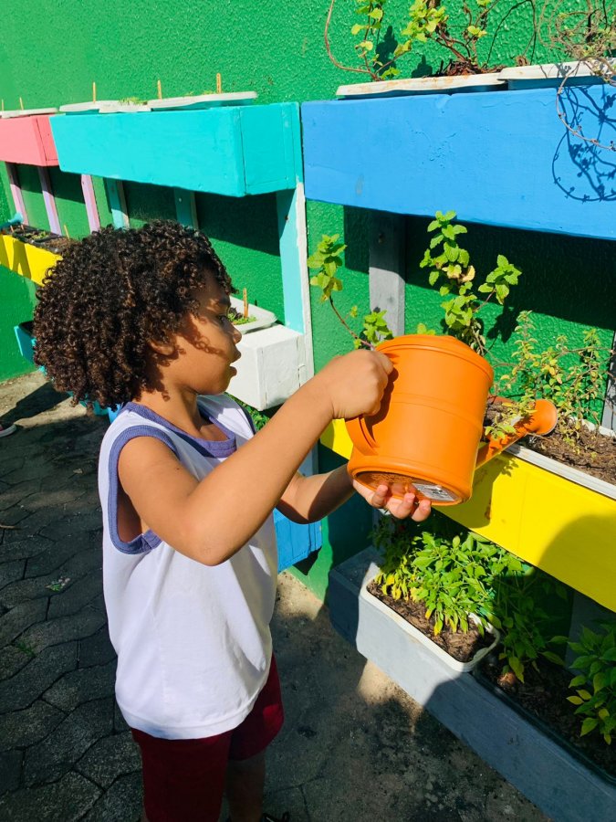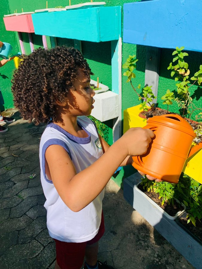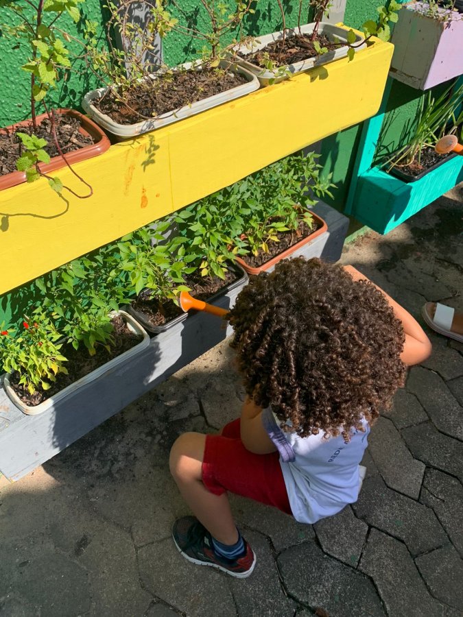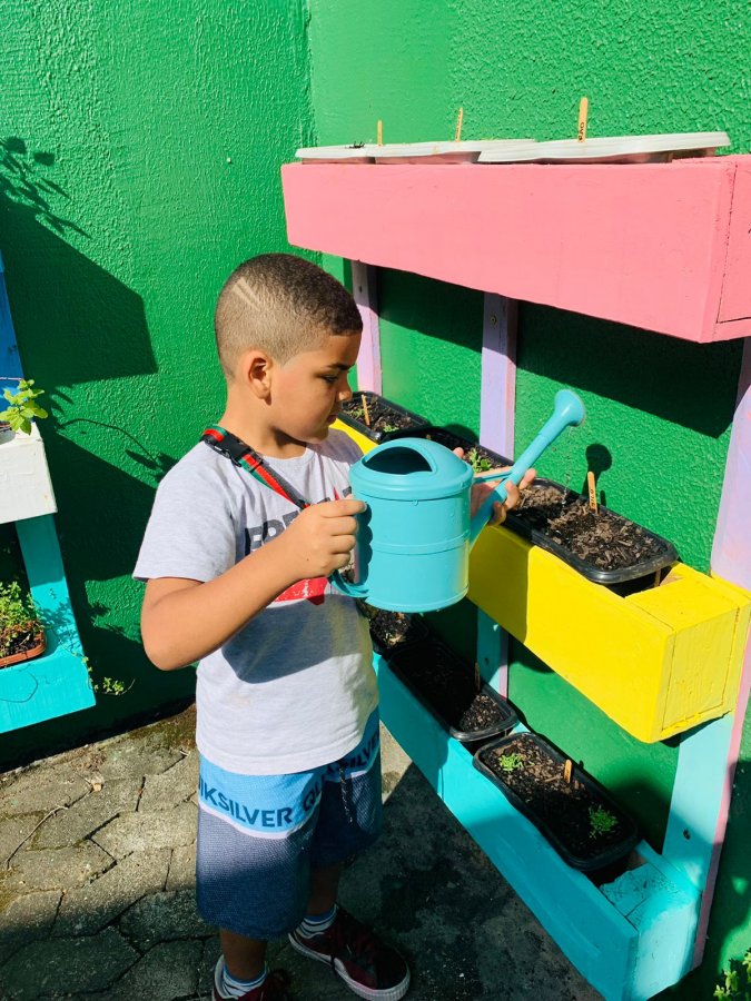 E as turmas de 3 a 5 anos estão com uma agenda matutina e vespertina para MOLHAR a horta.